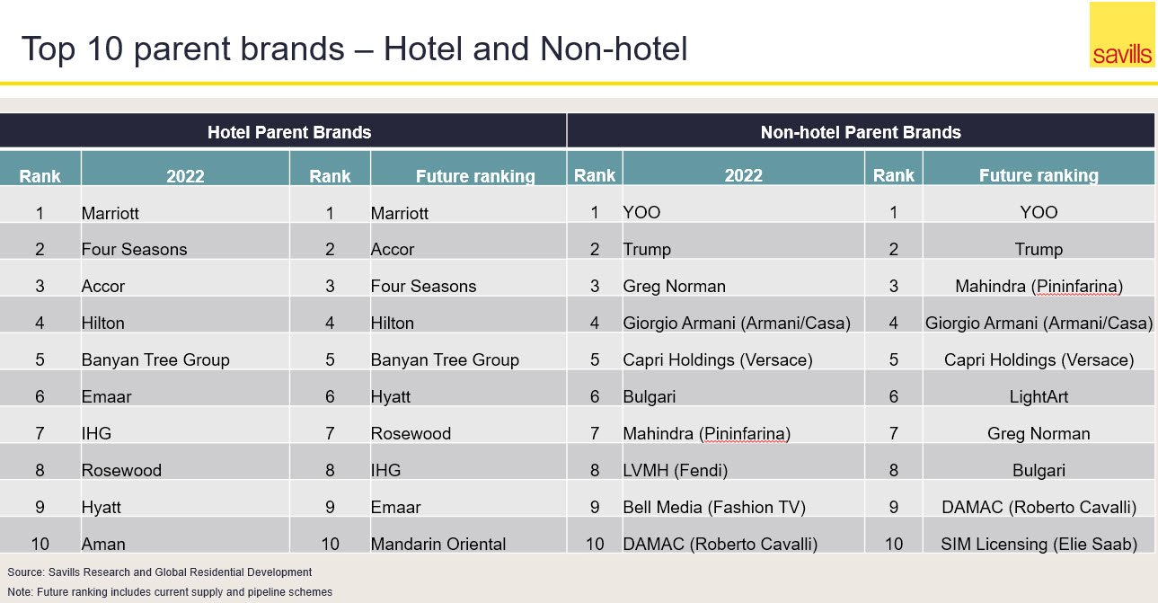 Just as the parent companies must differentiate themselves while maintaining growth in an increasingly crowded landscape, so too must the individual brands in order to attract buyers. For hotel brands, the top three spots are occupied by Four Seasons, The Ritz-Carlton, and St. Regis. Four Seasons and The Ritz-Carlton have been competing for first place in the rankings for years, and 2022 marks the first year that Four Seasons has clinched the top spot for hotel brands. Of the top three hotel brands, St. Regis has the largest pipeline with the brand projected to increase its supply by 138% by the end of the forecast period. St. Regis is not alone in its significant expansion plans; of the top 10 hotel brands, five have pipeline growth figures of over 100% and a further two have pipeline growth of 90% by the end of the period. Further down the table, many other hotel brands such as One&Only, Swissôtel, Grand Hyatt, and JW Marriott, among others, have pipeline growth over 150% for the forecast period, over the next 5 years. By contrast to the hotel brands, most non-hotel brands have fewer than 10 schemes in operation. YOO and Trump, the latter considered as non-hotel brand for the purpose of this report, are the exceptions to this trend, however, as they have been active in the branded residences sector for significantly longer than other non-hotel brands. Non-hotel brands tend to emphasise their differences from the hotels and focus much more on integrating elements of their specific brand via design, lifestyle, or amenities. Projected pipeline growth for most non-hotel brands is strong, though most are growing from a low base. These nonhotel brands often do not have the same depth of development infrastructure, from staffing to development support, compared to traditional hotel brands and cannot gain from the benefits of co-locating themselves with an affiliated hotel where complementary amenities, facilities and services can be shared across users.